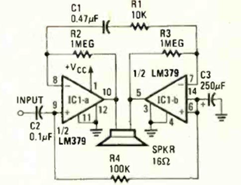 This bridge audio amplifier was found in the July 1984 issue of Radio Electronics magazine. The power supply is not indicated, so please consult the datasheet.