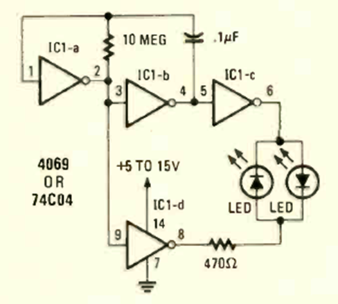 This simple circuit was found in the May 1979 issue of Radio Electronics magazine. The circuit has the frequency of the LEDs determined by the capacitor. The 470-ohm resistor can be changed up to 2.2k ohms depending on the brightness of the LEDs desired.