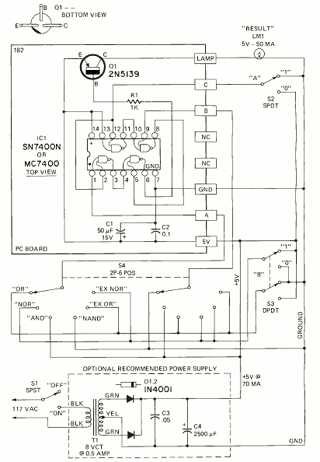 We found this circuit in the May 1972 issue of Radio Electronics magazine. Its purpose is to teach logic using integrated circuits of the TTL family. The 5 V power supply is included.