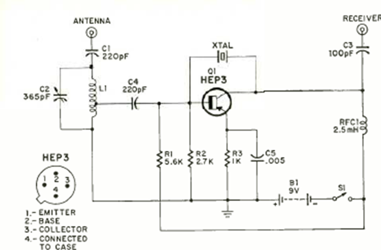 This circuit is from a Radio Electronics from March 1970. The crystal depends on the frequency at which the signal is to be captured and the resonant circuit determines the tuned band.