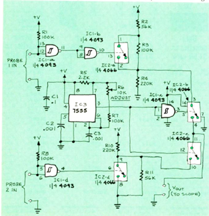 For low-frequency signals, this circuit transforms a single oscilloscope into a dual-trace. The circuit is from Radio Electronics magazine, October 1984.