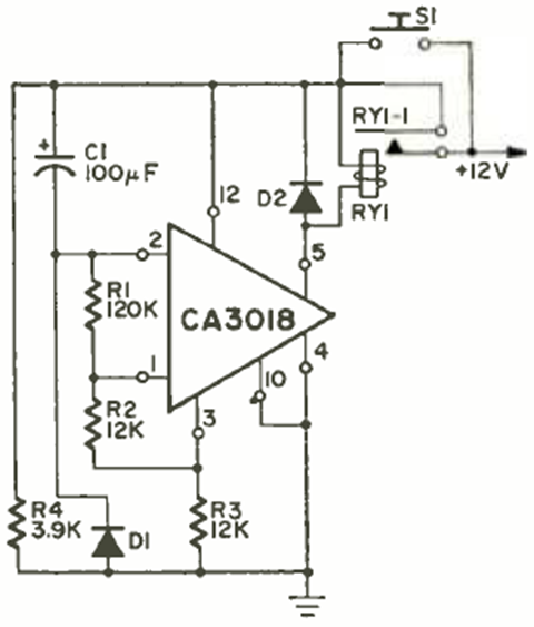 This application of the RCA integrated circuit released at the time was found in the August 1970 issue of Radio Electronics magazine. The relay must have a resistance greater than 240 ohms. The time is given by C1.
