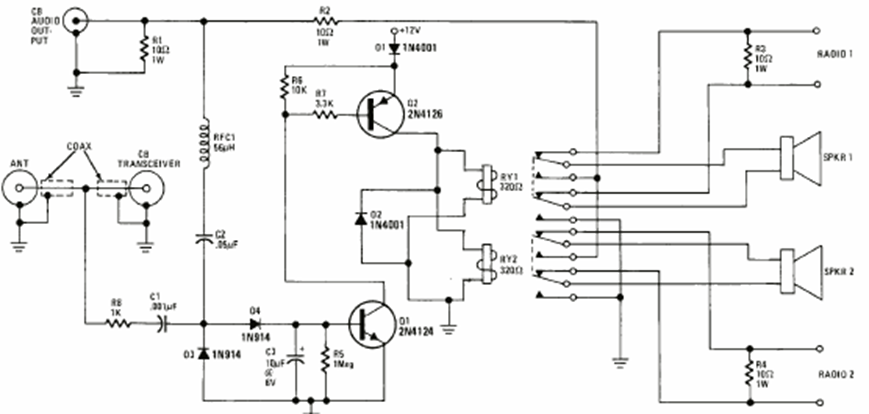 This circuit was found in the December 1977 issue of Radio Electronics magazine. The circuit uses two transistors and two relays to switch a transmitter and a receiver when switching between receive and transmit.