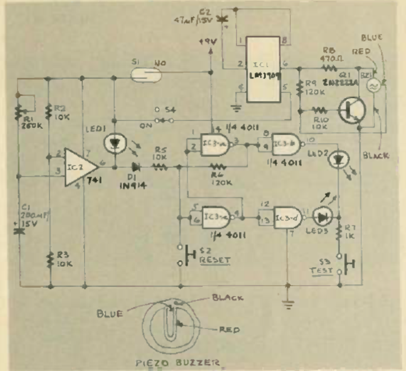This circuit is from Radio Electronics from March 1985. The circuit uses common components at the time and LEDs as indicators. The power supply is 9V.