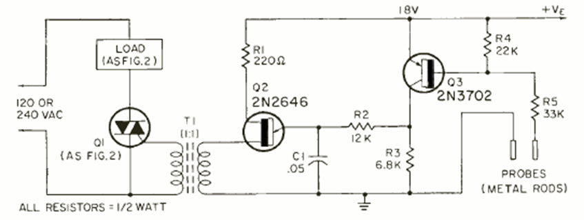This circuit is from a July 1970 Radio Electronics magazine. The sensors are metal probes. The 18 V power source must be isolated from the mains.