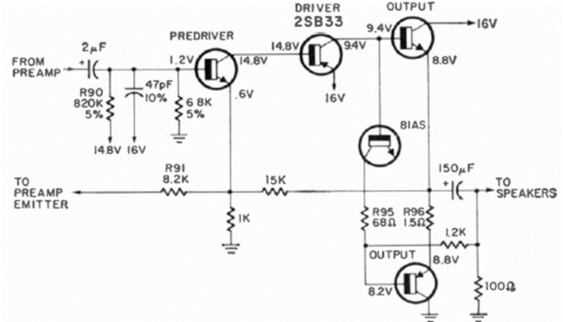 This circuit from a March 1971 Radio Electronics uses a transistor to stabilize the bias current of the output transistors. The circuit is médium power.
