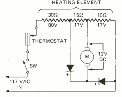 This circuit is from a Radio Electronics issue of May 1972. It consists of a commercial heating system in which a 12 V motor connected to the heating element circulates air. The motor connection point is calculated to correctly power the motor with half-wave rectification.