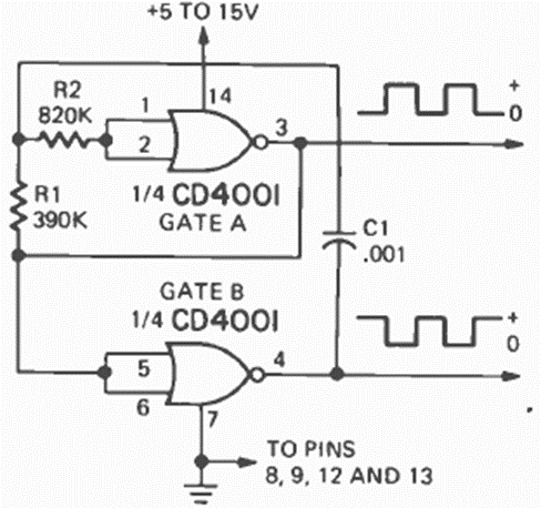 Found in the November 1974 issue of Radio Electronics magazine, this circuit has a frequency range determined by R1 and C1. These components can be changed to obtain a different range of frequencies