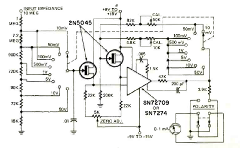 This circuit was found in the September 1972 issue of Radio Electronics magazine. The circuit uses an operational amplifier of the time and a symmetrical 9 V source.