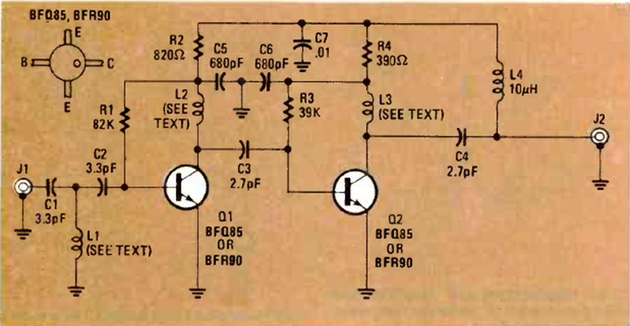 Created to serve as a booster for TV signals in the UHF band, this circuit was found in the March 192 Radio Electronics magazine. Assembly is critical, requiring a special board layout.