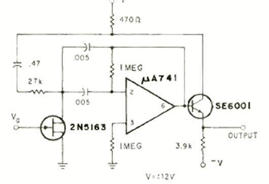 This voltage-controlled oscillator or VCO was found in a Radio Electronics magazine from July 1970. The operating system must be powered by a symmetrical source. The frequency depends on the capacitors.