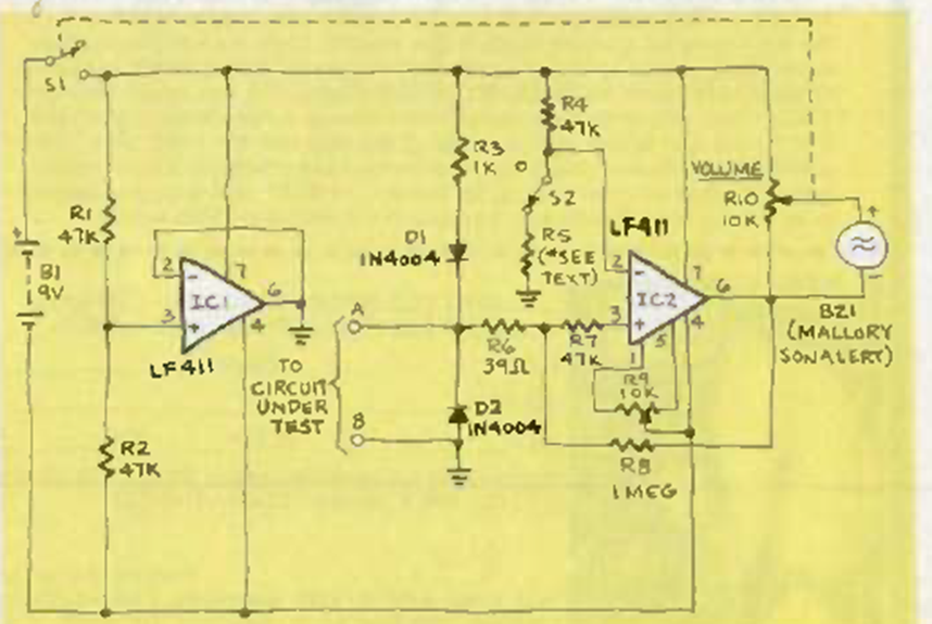 This sophisticated circuit with two LF411 operational amplifiers appeared in the November 1984 issue of Radio Electronics magazine. The circuit uses a Mallory buzzer as an indicator.