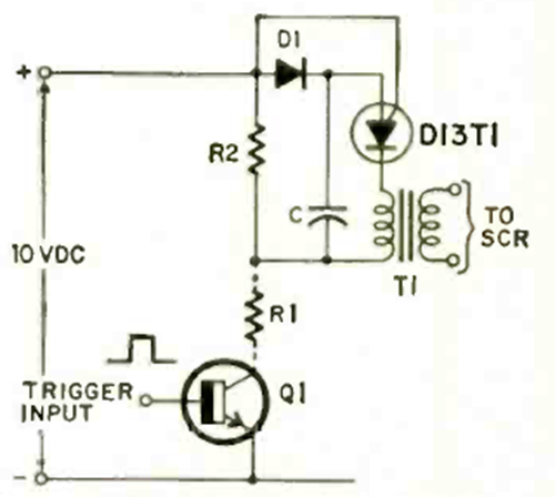 The purpose of this circuit is to convert a rectangular pulse into a sharp pulse for triggering an SCR. The circuit is from a Radio Electronics magazine from November 1970.