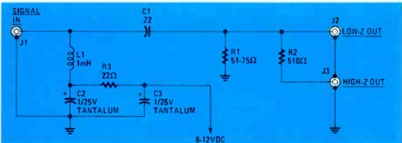 This circuit was found in the April 1983 issue of Radio Electronics magazine. Its purpose is to couple an antenna to two receivers without problems with coupling losses.