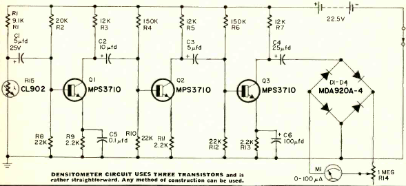 This circuit used in photographic applications was found in the May 1971 issue of Radio Electronics magazine. The circuit is used to measure transparencies using an LDR as a sensor and an alternating light source.