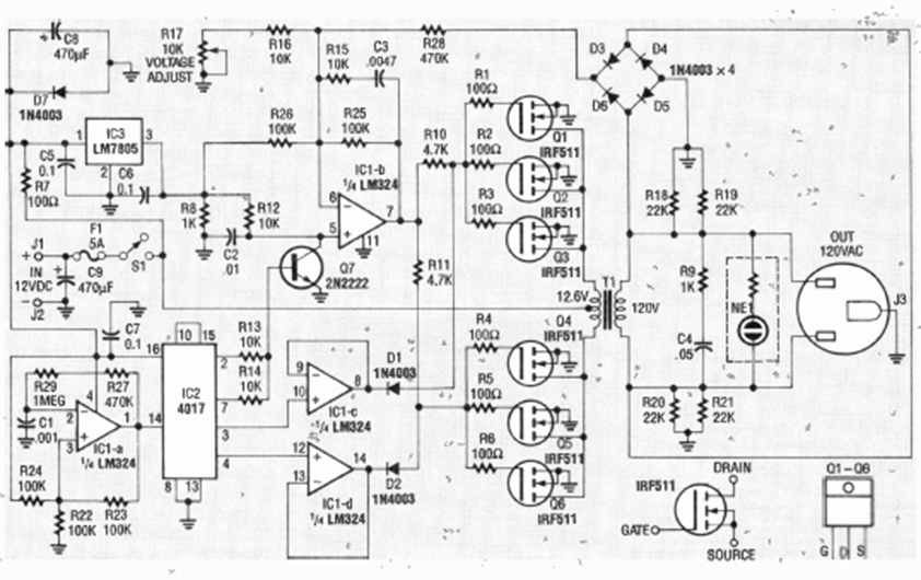 This circuit converts 12 V to 127Vac to power small electronics in the car. It was found in the 1993 edition of the Electronics Experimenter Handbook.