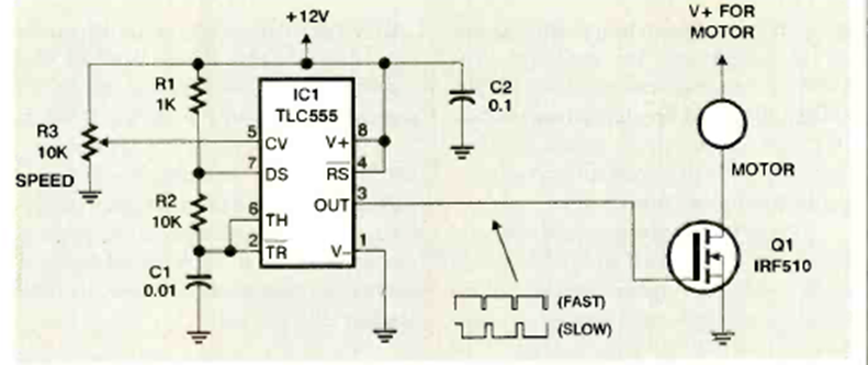 This simple circuit for motors that depends on the MOSFET used was found in the January 1998 Electronics Now magazine. The motor voltage does not need to be the same as the oscillator.