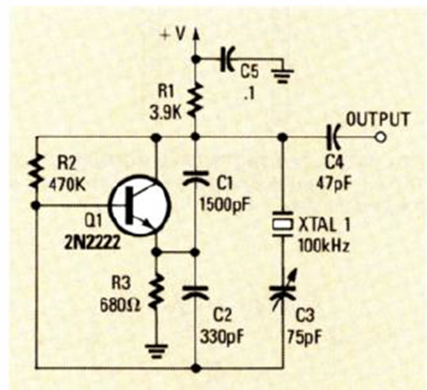 The frequency of this oscillator depends on the crystal. The transistor supports equivalent, and the power supply can be between 3 and 15 V depending on the transistor.