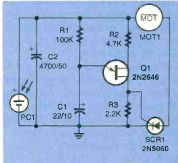 This simple robot or motor control circuit using a photocell as a sensor was found in the magazine Electronics Now of June 1997. The supply voltage is according to the motor.