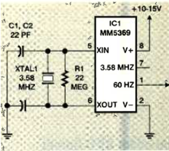 Found in the January 1998 issue of Electronics Now, this circuit uses a standard American TV crystal. The circuit must be powered by the indicated voltages.