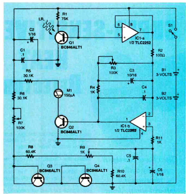 This heat detector was found in the August 1998 issue of Electronics Now magazine. The circuit uses a common phototransistor as an infrared sensor.
