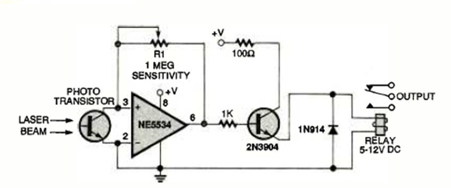 This circuit is more sensitive than the previous one, triggering when a laser beam that hits the phototransistor is cut off. The circuit is from the September 1996 issue of Electronics Now magazine.