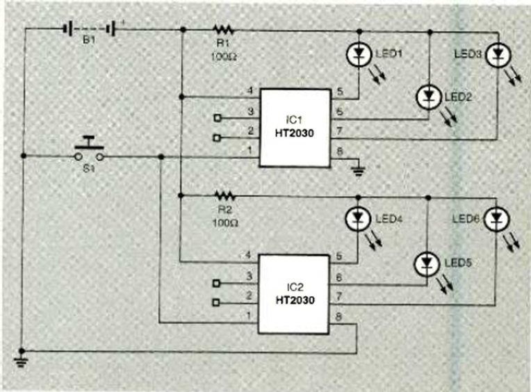 This circuit with two HT2030s powers 6 LEDs in a decorative flashing system. The circuit is from Electronics Now magazine, December 1997. The LEDs are fed in sequence.