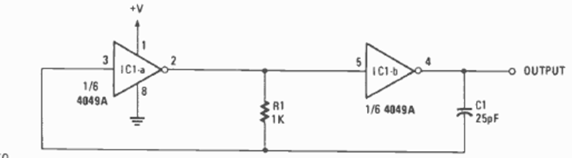 This is one of many configurations of this type that can be found on our website. The circuit uses two inverters and has the frequency determined by capacitor C1.