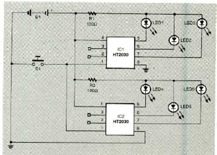 This circuit was published in the December 1987 Radio Electronics magazine. It uses two 555s to drive 6 flashing LEDs.