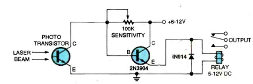 This circuit triggers a relay when a light beam that hits the phototransistor is cut off. The circuit is from Electronics Now and the supply voltage depends on the relay voltage.
