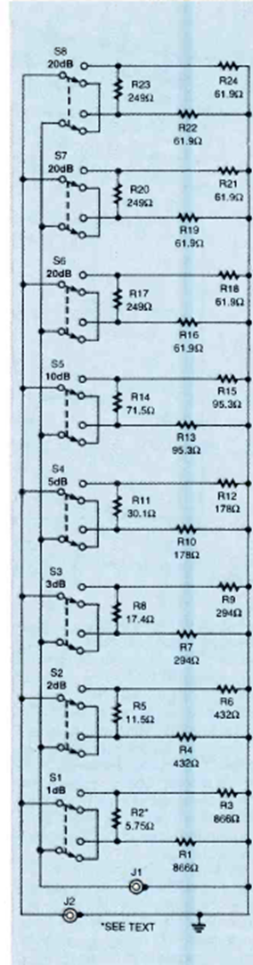 This signal attenuator was suggested by Electronics Now magazine in April 1999. The circuit is passive and controlled by manual switches.