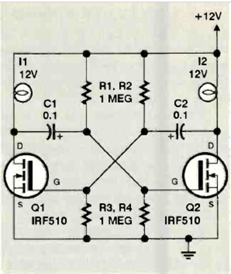 This circuit makes two lamps (or LEDs) blink at a speed that depends on C1 and C2. Any MOSFET can be used. The circuit is from Electronics Now, December 1998.
