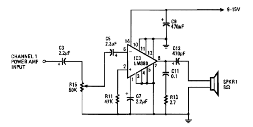This is a channel of a stereo amplifier and small power with the LM386 suggested by the Radio Electronics Experimenters in the 1981 edition. The power of a few Watts.
