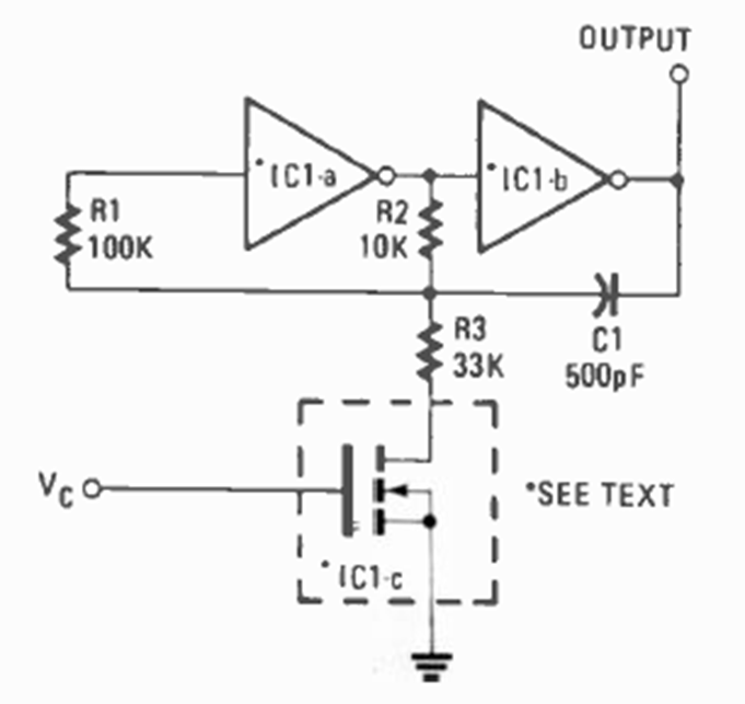 This circuit shows that we can implement a voltage-controlled oscillator with almost any CMOS that can be connected as an inverter. The circuit is from Radio Electronics from January 1987.