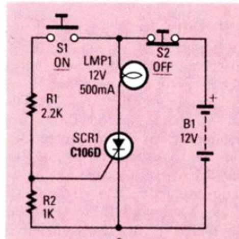 This circuit is used to switch direct current loads such as a lamp, for example. Remember that there is a voltage drop of around 2 V across the SCR in conduction.