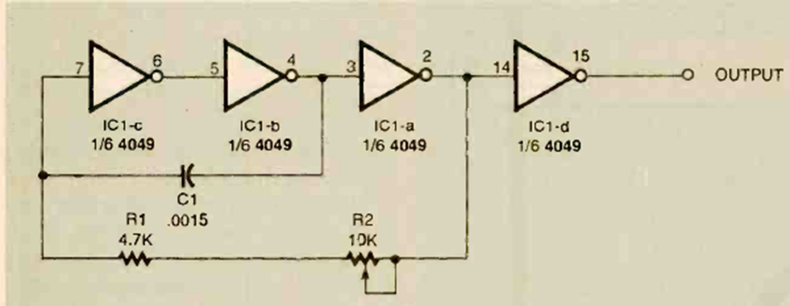 This circuit was found in the July 1998 issue of Electronis Now magazine. It is a traditional gated version of the 4049 and has its frequency controlled by R2.