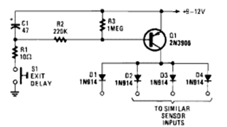 This circuit provides a delay for the activation of an alarm, giving the owner time to leave the premises. The circuit is from the 1995 Encyclopedia of Electronic Circuits Volume 5.