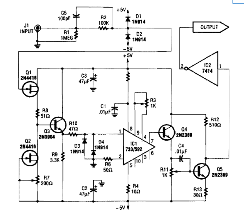 This circuit for frequencies up to 100 MHz and 1M -ohm input impedance was obtained from the Encyclopedia of Electronic Circuits Volume 5 of 1995. The circuit uses an operational circuit of the time as a base.