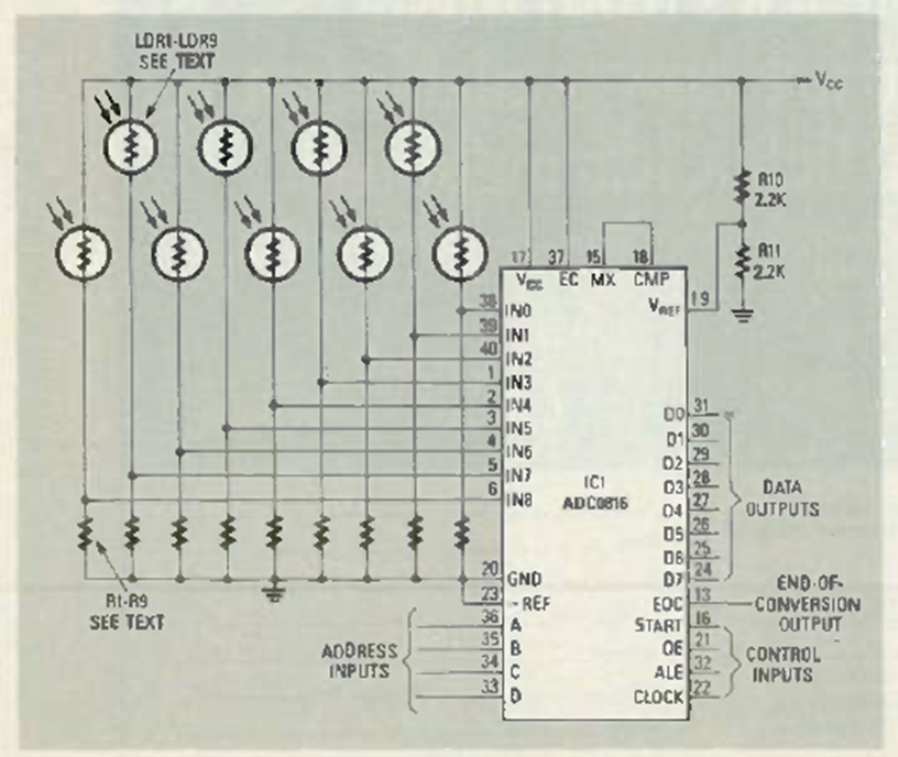 This robot vision circuit was published in the December 1986 issue of Radio Electronics magazine. The circuit uses 9 LDRs as sensors forming a sensor array. The circuit must be powered with 5 V.
