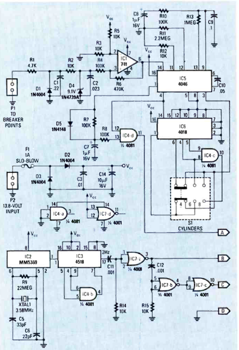 The assembly of this circuit was described in an article in the magazine Radio Electronics of June 1987. The CMOS integrated circuits are of types that can still be found. The indicated outputs go to an indicator circuit that is given below.