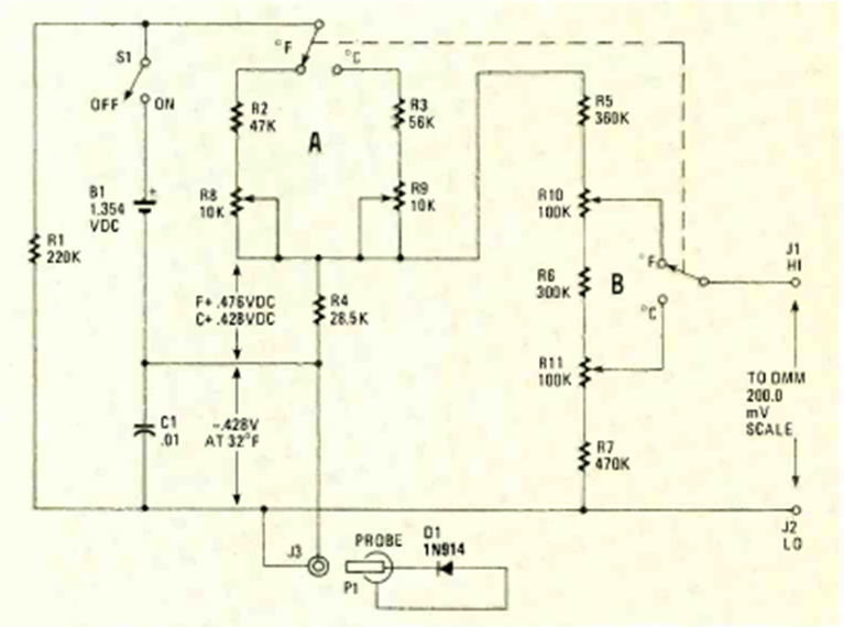 This circuit is used to sense temperatures in degrees Celsius and Fahrenheit. The circuit is from Special Projects from 1983 in Radio Electronics magazine.