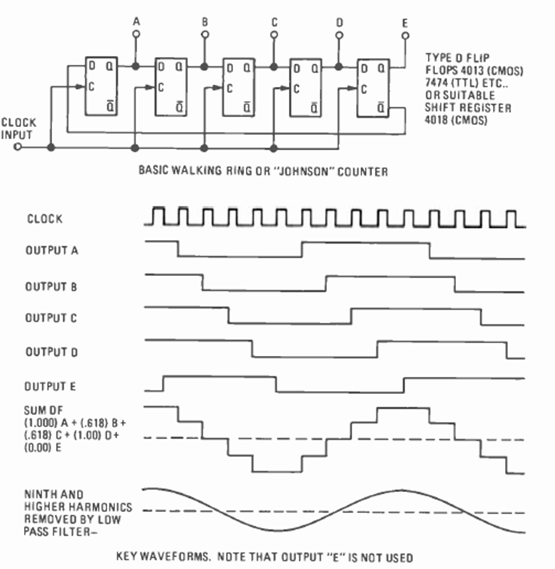 The figure shows how to associate flip-flops in a shift register to obtain a lower frequency sinusoidal signal. The circuit is from a Radio Electronics from November 1976.
