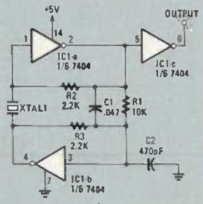 We found this circuit in December 1986, Radio Electronics magazine. It uses 3 inverters and has the frequency determined by the crystal. The power supply is 5 V.