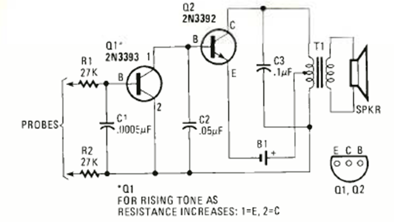 This simple continuity tester consists of an oscillator found in the 1983 Electronics Experimenter Special projects magazine. The circuit is powered by a single battery.