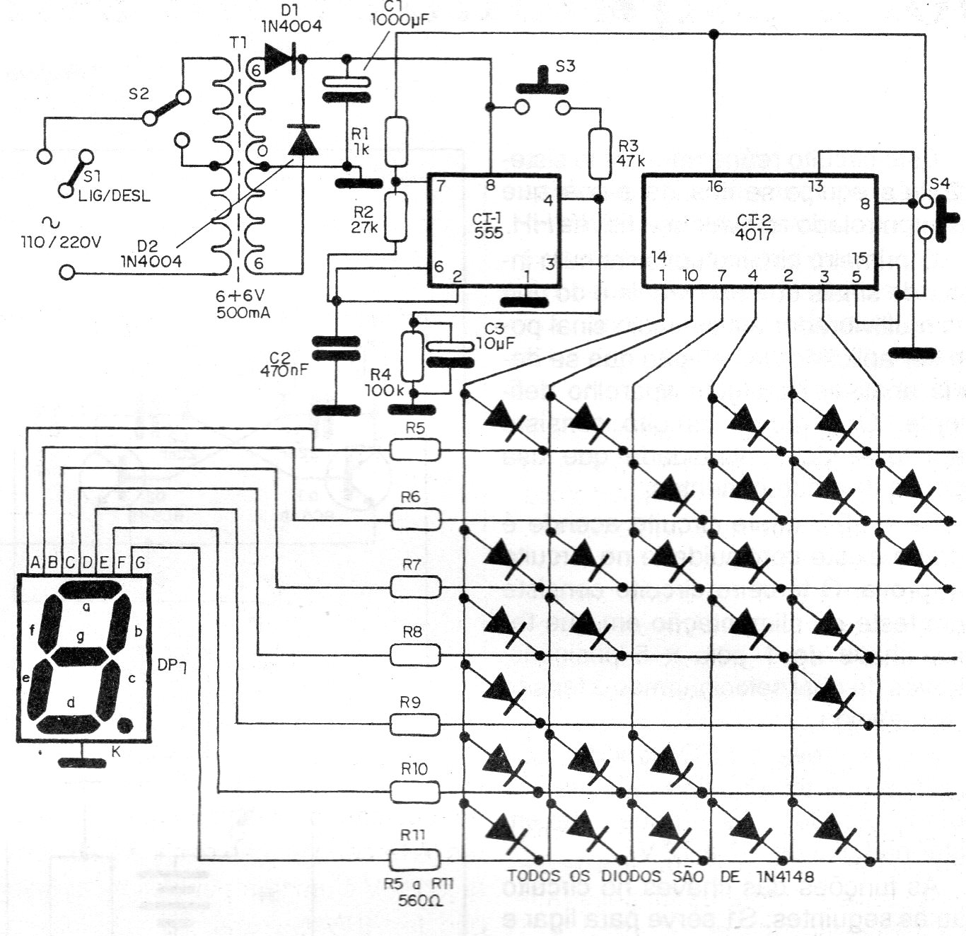 This is one of the many electronic dice that the reader can find on this site. The difference is that it generates the number drawn from 1 to 6 in a display of seven segments of common cathode. The circuit uses components still common in the market and is powered by a small source already included in the design.
