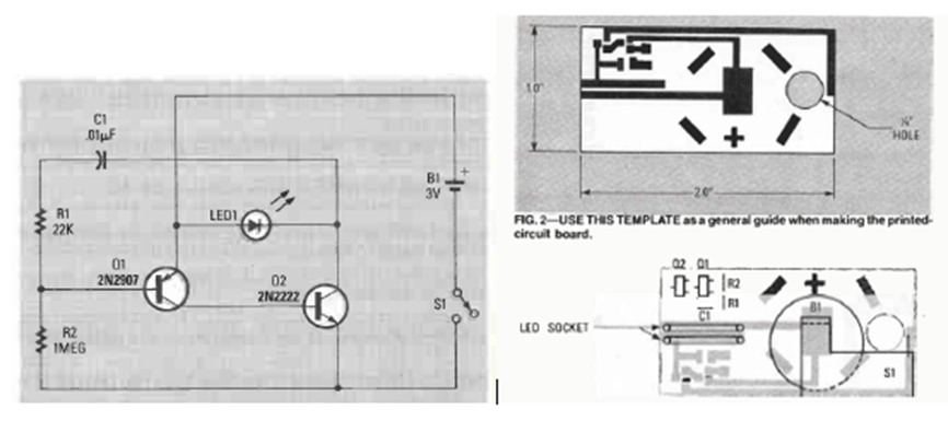 This circuit is from the 1989 special edition of Radio Electronics Experimenter. The circuit was created with SMD components to be mounted on a keychain.