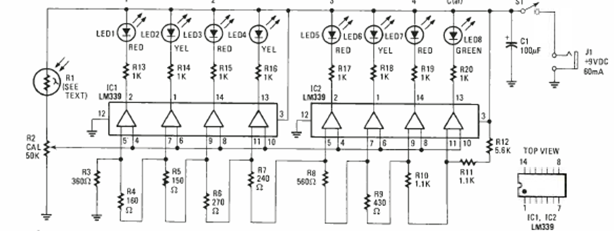 This circuit for photography uses was found in the Electronics Experimenter Handbook Special projects magazine from 1983. The bargraph circuit powers 8 LEDs.