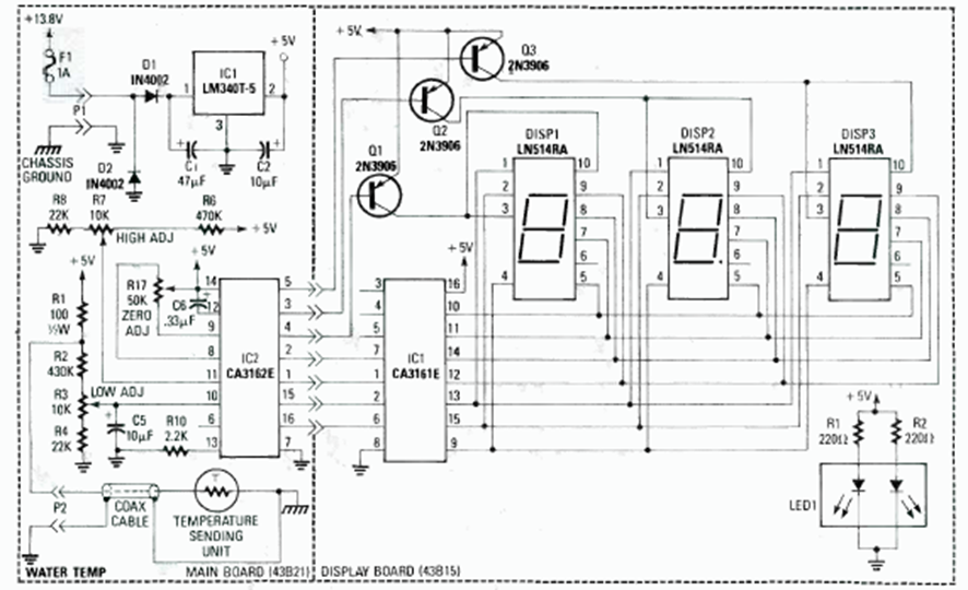 Using a pair of period A/D converters, this 3-digit circuit was found in the 1992 Radio Electronics Experimenter magazine. The sensor is a thermistor.