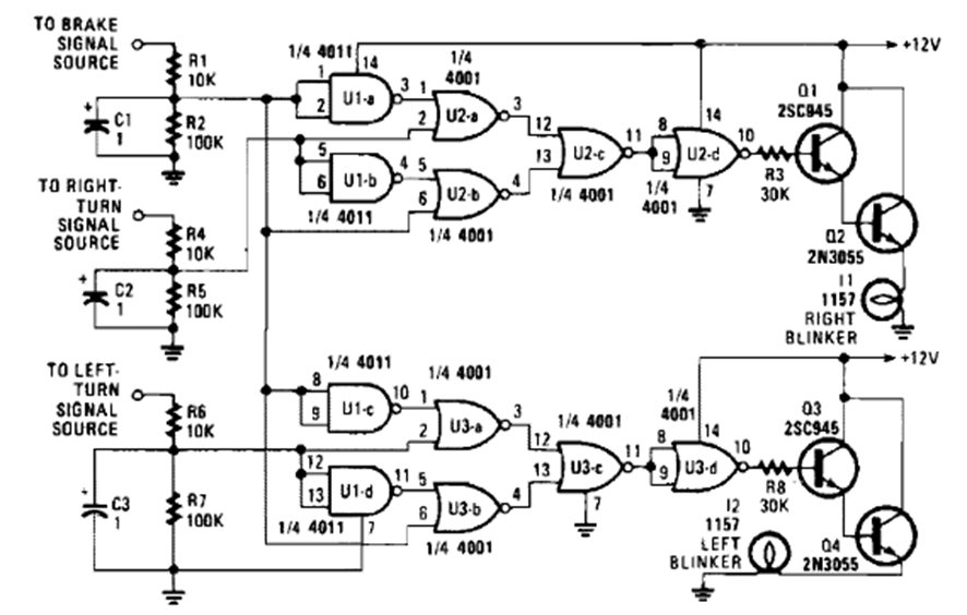This circuit for cars of the time was found in a Popular Electronics magazine from the 90s. The circuit is based on CMOS logic that is common even today.