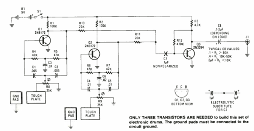 The sound of drums can be obtained with these two touch-triggered double-T oscillators. The circuit is from a Radio Electronics Special projects from 1993.